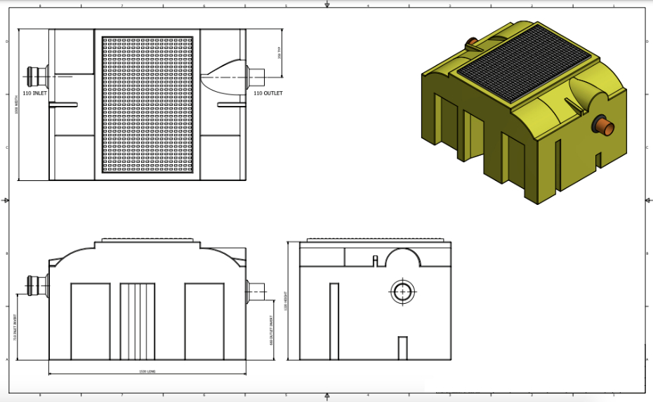 | Symbol | Nominal flow [l/s] | Tank volume[l] | Inlet/outlet diameter[mm] | Inflow height[mm] | Outflow height[mm] | Tank dimension[mm] | desilter chamber [l] | Separation chamber[l] | Number of manholes | ||